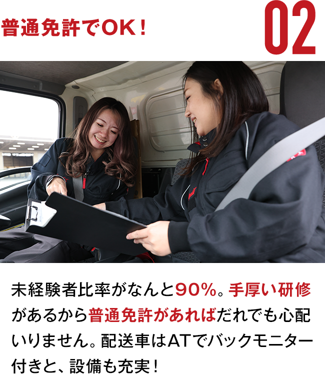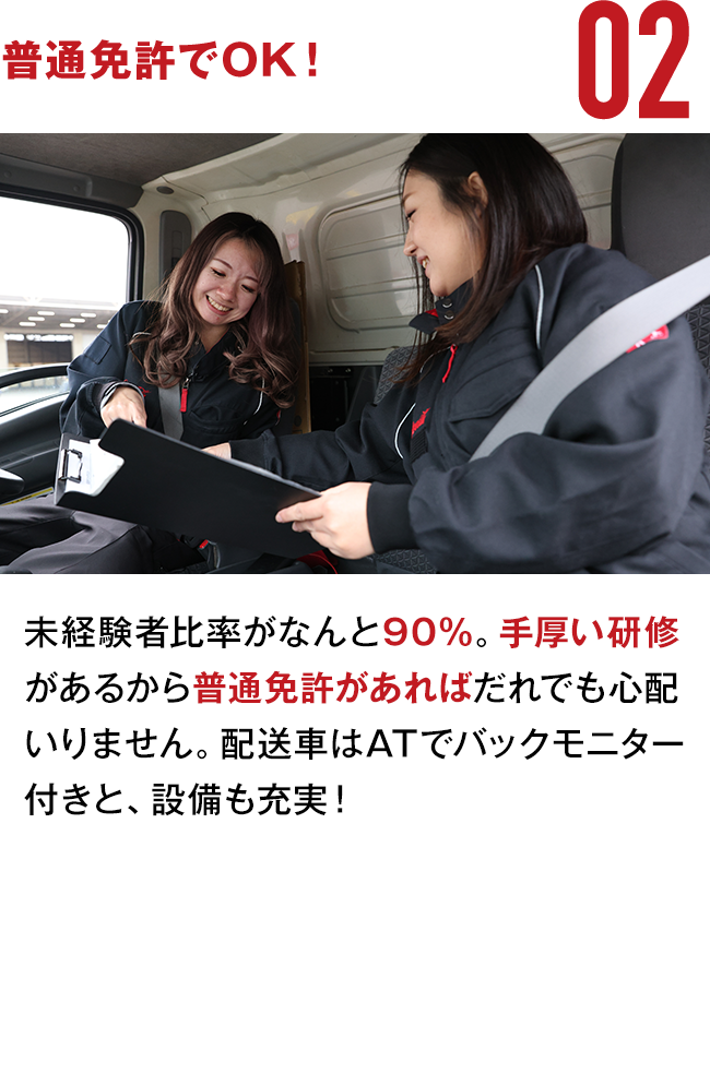 ■ 3ヵ月間の寮費全額補助 ■ 交通費支給(規定あり) ■ 社会保障完備(雇用・労災・健康・厚生年金) ■ 残業手当 ■ 配送手当(売上に応じて支給) ■ 地域手当(勤務地による、規定あり) ■ 安全運転表彰金(無事故・無違反の方が対象) ■ 制服貸与 ■ 各種研修あり |