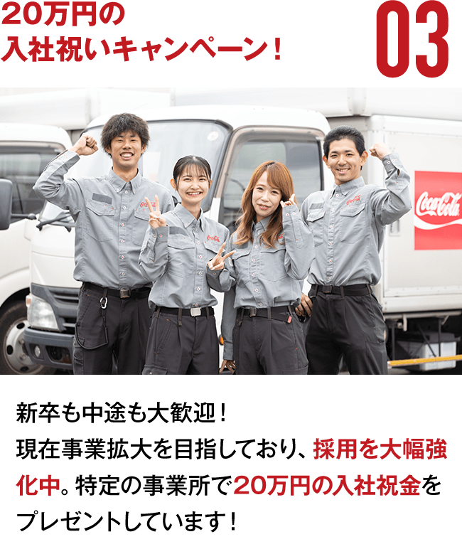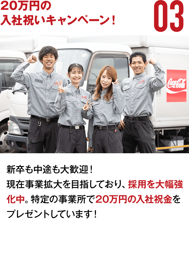 | 入社祝金 | 下記の営業所で入社祝金20万円をプレゼント! ・東海営業所(職種:店舗配送) ・名古屋守山営業所(職種:店舗配送) 詳細は面接にてご確認ください。 |