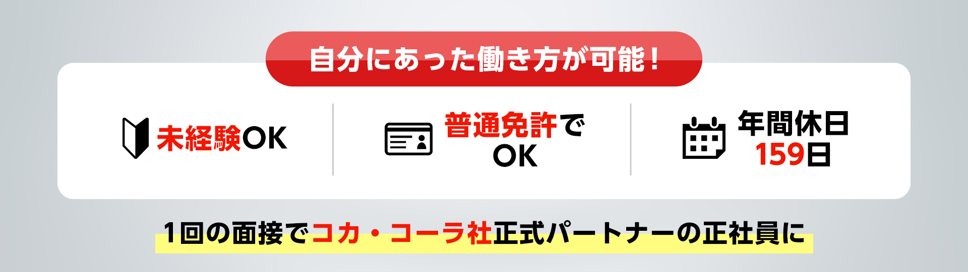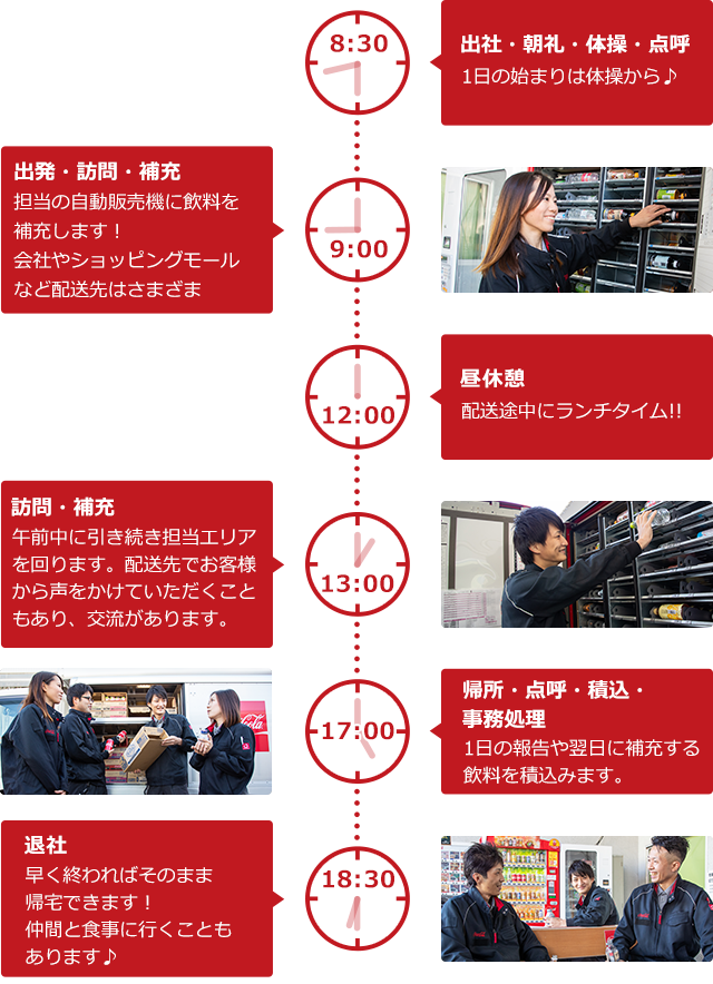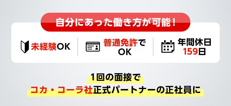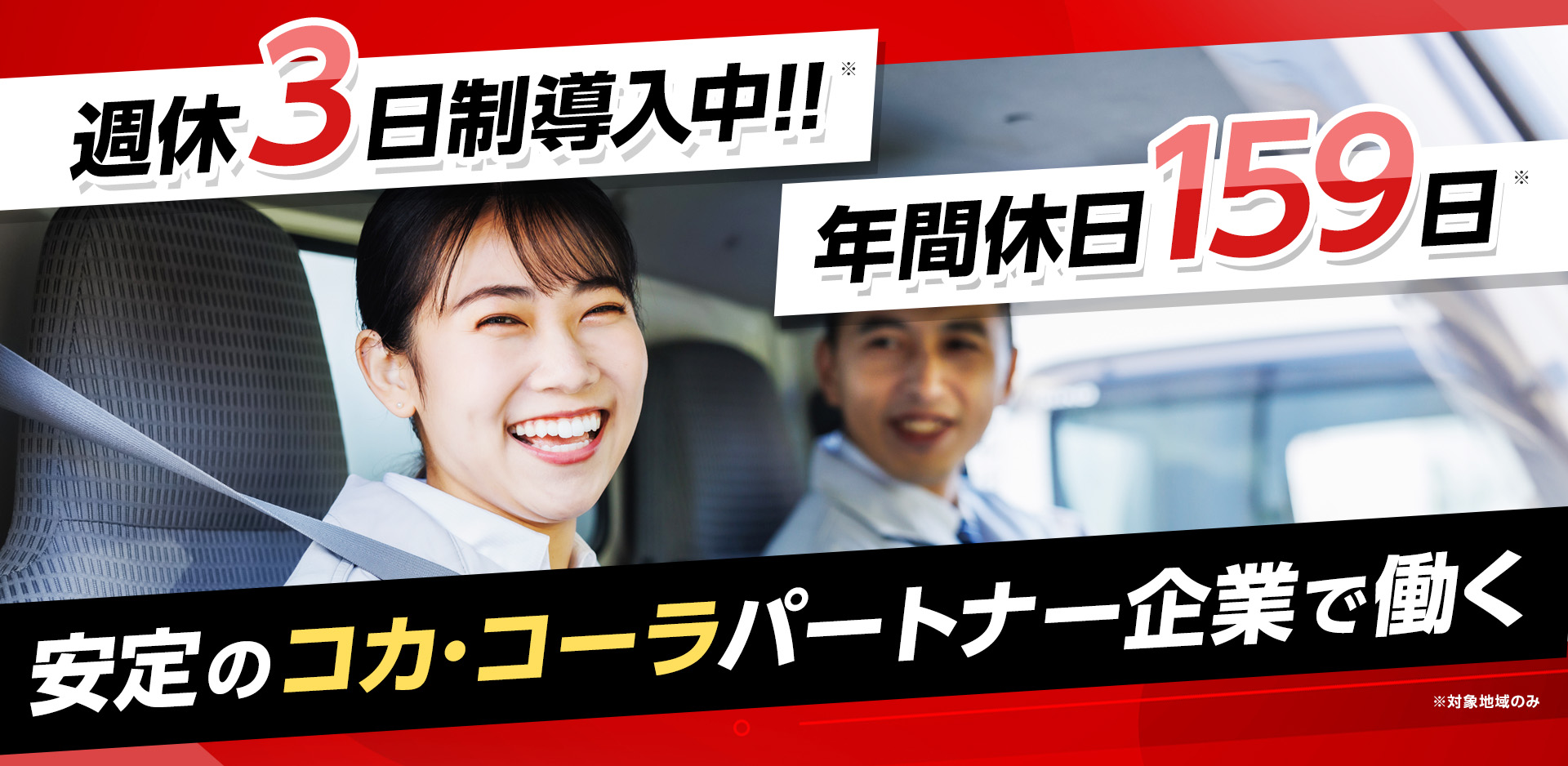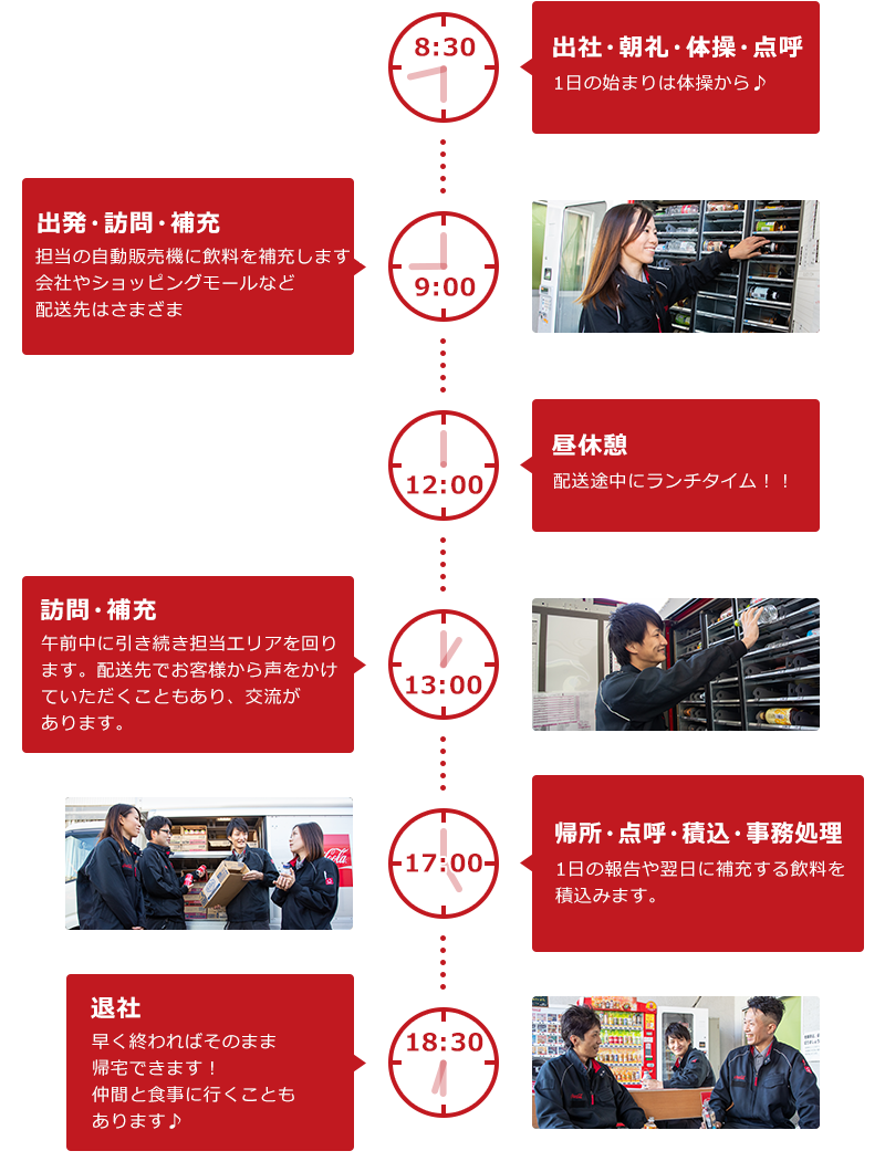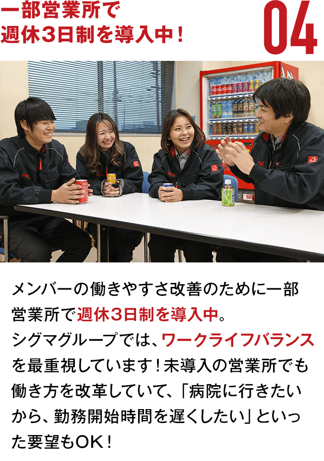 ■ 週休3日制/年間休日159日(自動販売機補充員のみ) ■ 慶弔休暇 ■ 有給休暇 ■ 産前・産後休暇 (取得実績あり) ■ 育児休暇 (取得実績あり) ■ 勤務シフトは毎月の申請制 |