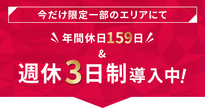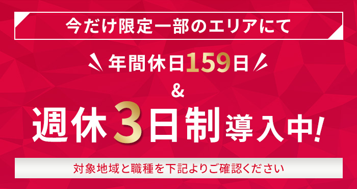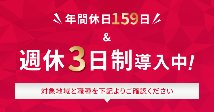 ■ 週休3日制/年間休日159日 ■ 慶弔休暇 ■ 有給休暇 ■ 産前・産後休暇 (取得実績あり) ■ 育児休暇 (取得実績あり) ■ 勤務シフトは毎月の申請制 |