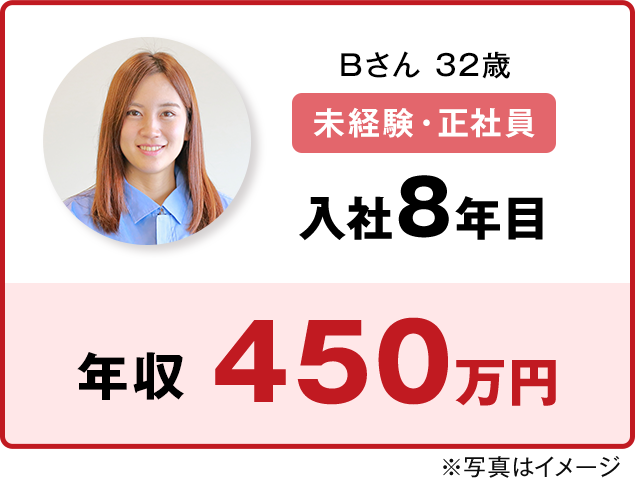 月給23万以上 ≪年収例≫ 380万円/入社2年目/25歳 450万円/入社8年目/32歳 |