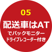 バックモニター、ドライブレコーダー付き運転に自信がないという人でもバックモニターがついているので運転しやすく、ドライブレコーダー搭載なので安心して仕事ができます。